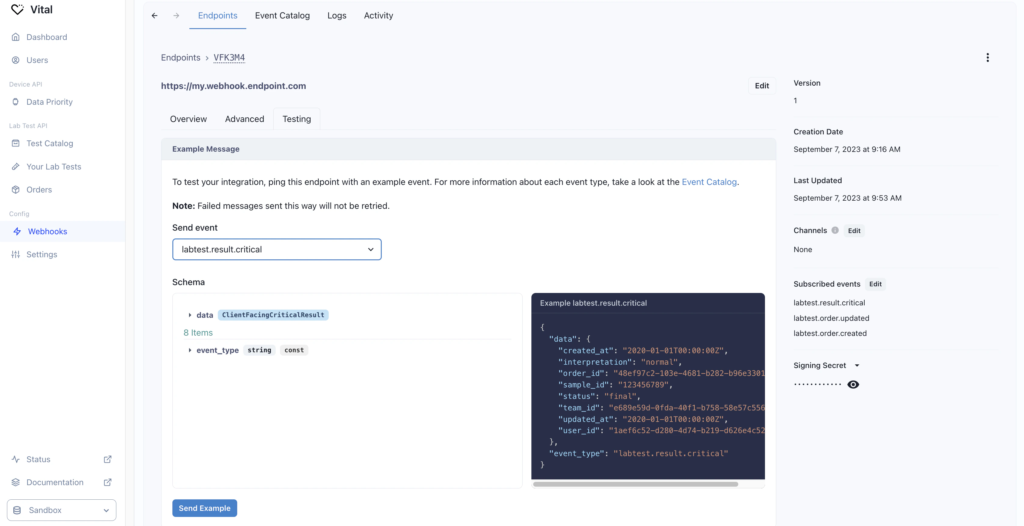 where you can register an endpoint and subscribe to the labtest.result.critical event.