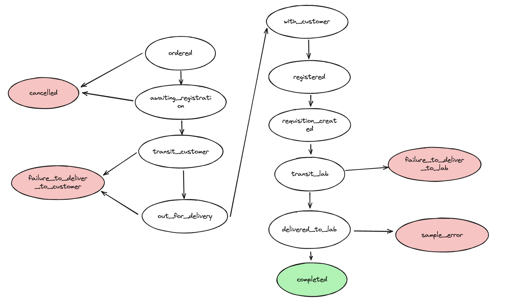 ordered: Junction received the order, stored it into our system, and started processing it asynchronously.awaiting_registration: Order is created but no user has been registered yettransit_customer: The testkit is shipped and in transit to the customer.out_for_delivery: The testkit is out for delivery.with_customer: The testkit is delivered to the customer.registered: Order has been registered, and a requisition will be created.requisition_created: An order requisition form was validated and created with the partner laboratory, making the order available to be carried out.transit_lab: The customer has sent the testkit back to the lab.delivered_to_lab: The lab has received the testkit.failure_to_deliver_to_customer: The shipping company was unable to deliver the testkit to the customer.failure_to_deliver_to_lab: The shipping company was unable to deliver the testkit to the lab.problem_in_transit_customer: The shipping company encountered a problem while delivering the testkit to the customer.problem_in_transit_lab: The shipping company encountered a problem while delivering the testkit to the lab.sample_error: The collected sample was unprocessable by the lab.completed: The laboratory processed the blood sample and final results are available.cancelled: The order was cancelled by either the patient, Junction or you.